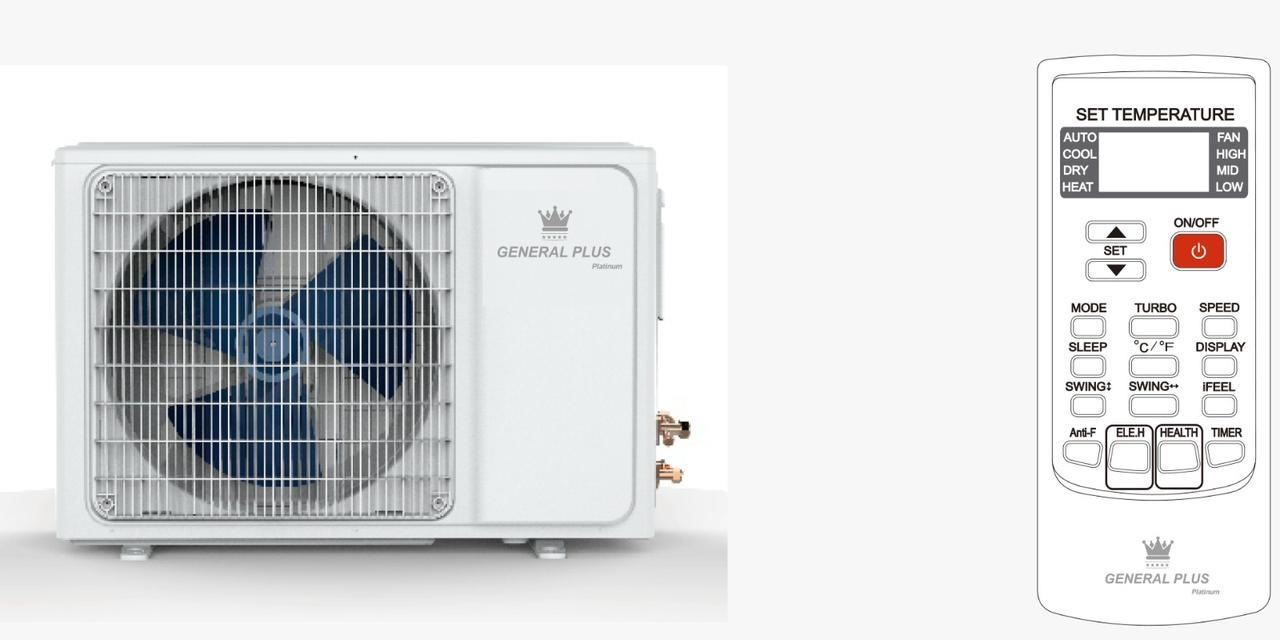 • استمتع بالراحة واالأجواء المنعشة مع مكيف سبليت جنرال بلس بلاتينيوم البارد. الذي يتمتع بتصميم عصري أنيق، مما يضمن لك تجربة تبريد مريحة وفعالة.